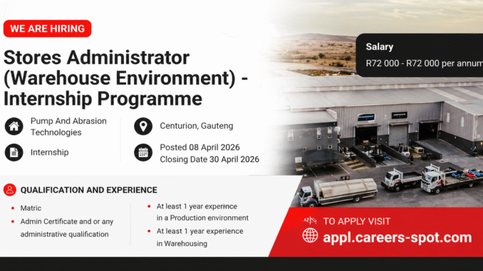 Pump and Abrasion Technologies is offering a Stores Administrator (Warehouse environment) Internship Programme based in Centurion, Gauteng. This opportunity sits within a warehouse setting and is designed for candidates who want hands-on experience in stock control, inventory systems, and day-to-day warehouse administration.