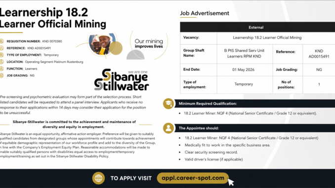 The Learnership 18.2 Learner Official Mining at Sibanye Stillwater is a practical pathway into one of South Africa’s key industries. It is not an easy route, but it is a structured and respected one.